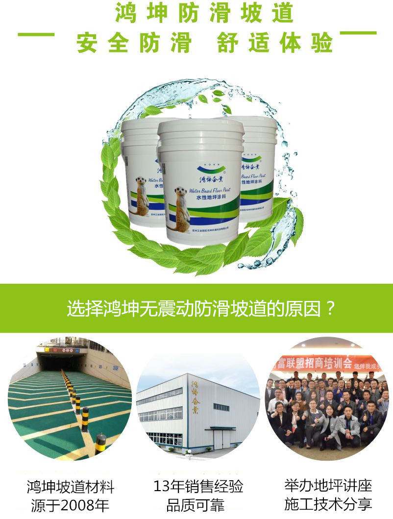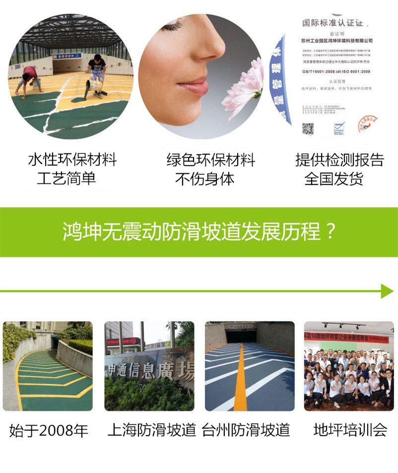 鴻坤無震動止滑車道是由特殊骨料與特種水泥、顏料及添加劑組成。現(xiàn)場添加水性樹脂混合后攤鋪。