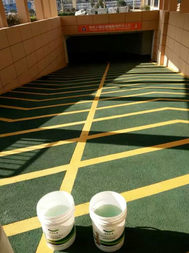 無震動防滑坡道材料包括水性樹脂和坡道骨料,顏色分為黃、綠、灰三種,根據一定的比例將水性樹脂和坡道骨料進行攪拌批刮,導線箭頭用美紋紙設計,干燥后即可成型,養護一周投入使用。