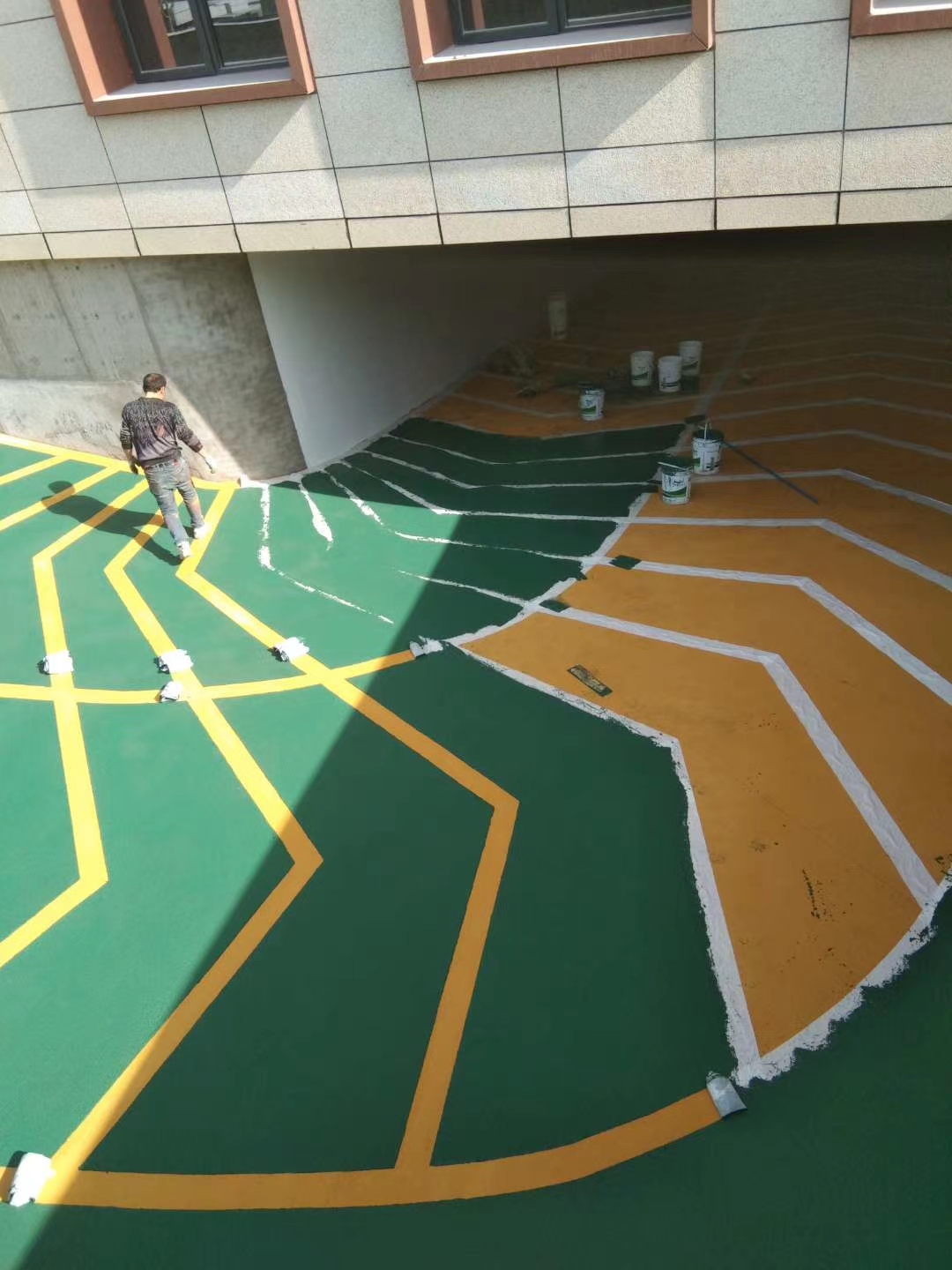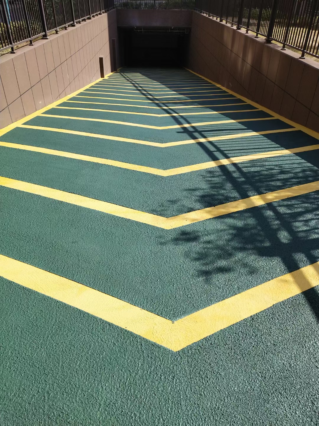 鴻坤防滑坡道的施工步驟科學(xué)嚴(yán)謹(jǐn)。首先是基層處理,通過查找、清除空鼓部分,全面清理、打磨地面,去除油污,為后續(xù)施工提供一個(gè)粗糙、潔凈、平整的基礎(chǔ)面。接著進(jìn)行封閉底涂施工,將鴻坤封閉底涂按 1:4 的配比與水充分?jǐn)嚢瑁?2 - 3 次均勻涂在素地表面,保障地面的附著強(qiáng)度。然后是抗壓層施工,將水性樹脂按 1:3 加水?dāng)嚢杈鶆颍徛尤牍橇蠑嚢瑁娩忼X鏝刀攤鋪形成 2mm 厚的抗壓層,增強(qiáng)車道的抗壓、耐沖擊性。之后可根據(jù)設(shè)計(jì)要求粘貼美紋紙?jiān)O(shè)計(jì)顏色花樣。再進(jìn)行止滑層施工,同樣將材料攪拌均勻后,先用鋸齒鏝刀攤鋪,再噴涂一遍,形成 3mm 厚的彩色條形止滑帶。最后是清理養(yǎng)護(hù),將鴻坤養(yǎng)護(hù)劑均勻涂布在面層表面,保養(yǎng)一周即可使用。